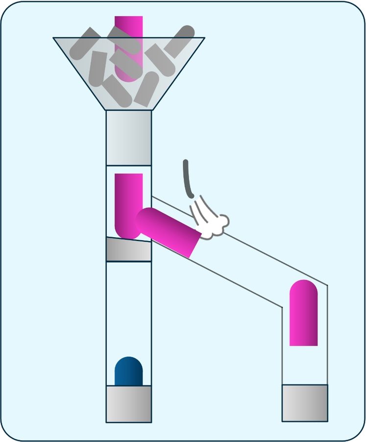 First, pins that have been placed in a receptacle shaped like a funnel go down into the tube one at a time.