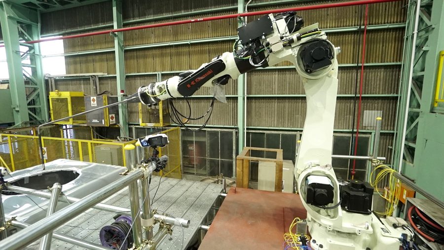 Sojitz Machinery Corporation is a general machinery trading company that distributes a wide range of manufacturing equipment, including the induction furnaces from Fuji Electric. The Mobility Division of Sojitz Machinery has proven results in the handling of a large number of the industrial robots that are essential for automobile production lines. As Yukio Kakuta, Specialist Department Manager of the Sojitz Machinery Mobility Division, Mobility Department 1, Section 2 says, “With the Successor, in addition to the operation originally intended with robots, operations that were impossible with just the robot alone can be complemented with the person performing remote operation instead. We thought that we would be able to create products with merits for the customers if we used that feature to create robot systems for sectors that have problems because automation has not been achieved.” In October 2020, Fuji Electric and Sojitz Machinery started to consider the use of the Successor in the slag scraping work for the induction furnace. In order to verify the movements of the robot, remote experiment equipment was set up in one corner of the Fuji Electric Su🃏zuka Factory, with the combina♍tion of a real 5-ton induction furnace and the Kawasaki BX200L vertical articulated robot and the Successor.
