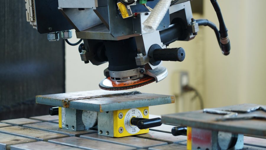 For finishing work (to make the required dimensions to the specification and good appearance) of comparatively large workpieces, automation has still not progressed and the majority of the work relies on human workers. Specially, grinder work is a heavy work, where the workers must wear a helmet, glasses, a dust mask, ear plugs and leather gloves. They must also hold a heavy grinding tool and the work involves ibration, noise, sparks and dust. As Mr. Kozuki explai🦩ns, it is work that requires labor and time, and “There are restrictions on continuous working time by organizations related to industrial accident prevention. There are also guidelines requiring rest time for a specified period after the work.” To reduce the burden of the grinder work and improve the efficiency, it was decided at the Harima Works to apply the Successor-G for grinding gas cutting traces remaining on steel plates. The target workpiece is three steel plates of 50 mm thick and 4-meter square steel plates joined together. The grinding work previously took between 1.5 and 2 days to complete.